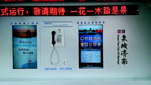 此外,亭内设有两块显示屏。其中一块提供多媒体推广服务,另一块是可以触摸使用的智慧旅游查询服务系统。在这个系统首页,包括济南概况、旅行社、旅游资讯等十个不同选项。轻点几下,就能帮助市民游客轻松查阅公交换乘、景区景点、酒店住宿、购物美食等信息。通过拨打亭内设置的旅游服务热线电话12301则可以进行旅游问讯、旅游投诉,享受旅游救援和提示等服务。