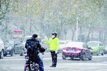 在风雪中执勤的交警。