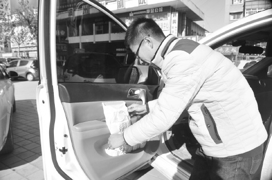 工作人员在车门上,贴车载垃圾袋。
