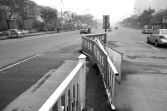 30日,记者在市中区西昌路鲁南水城路段一路口处发现,原本笔直排列的护栏因受到外力撞击,变得十分“曲折”。周边居民表示,这个地方应该是前两天下雪的时候有车不小心撞的,希望市民经过注意安全。 本报记者 袁鹏 摄影报道