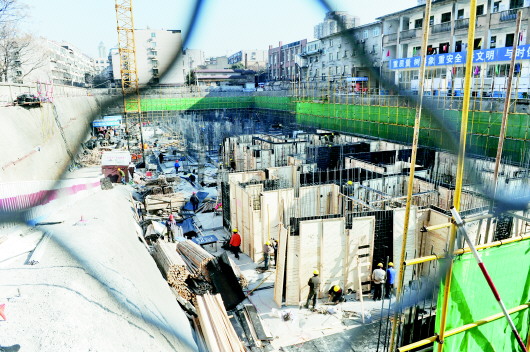 21日,山师北街著名的“地王”地块,工人冒着严寒进行基础工程施工。为加快进度,他们于近日申请了夜间施工许可。这块“地王”自诞生后命运多舛,一拖拖了十几年,如今终要修成正果。 本报记者 周青先 摄