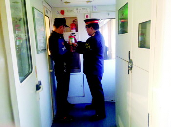 2016年春运大幕即将拉开,青岛客运段烟京车队五组为了给旅客创造安全舒适的旅行环境,认真检查列车阴暗处所和设备设施。图为列车长和乘警检查列车灭火器。 (毕凯)