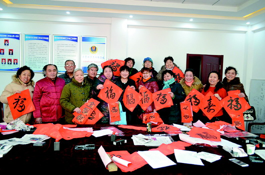 每逢春节,社区很多居民都期待着家里贴一副有品位的春联。社区里的书法爱好者也不乏其人。如今印刷出来的春联已不新鲜,手写的春联和福字却成了“稀罕品”,请书法高人写的春联和福字,贴在大门上,里里外外透着文化味。