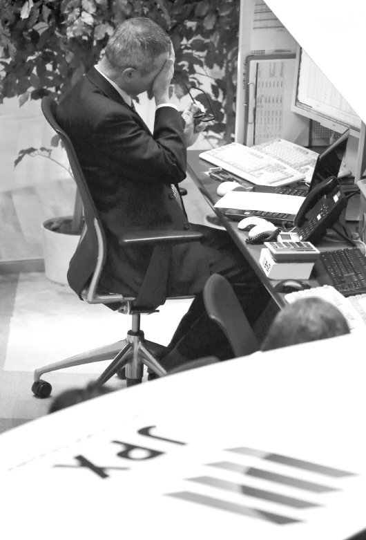 2月9日,一名职员在日本东京证券交易所内工作。当天东京股市暴跌5.40%,逼近16000点关口。 新华/美联