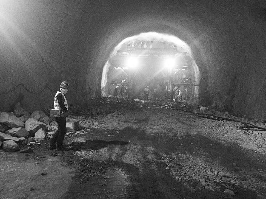 17日上午,记者来到瓦贵区间2号斜井,在2号斜井的入口处,一台“三臂凿岩台车”正在调试准备入场。步行至斜井底部,记者看到斜井底部的隧道正线两侧有工人正在电焊施工,隧道内已经有挖掘机等设备入场。