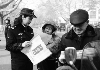 近日,青州市公安局东关派出所民警向居民群众通过发放安全防范常识“明白纸”。今年以来,青州市公安局通过走访群众倾听呼声、定期不定期召开警民座谈会、电话预约上门开展户籍服务等多形式,全力打造“平安青州”,确保当地居民群众安居乐业。