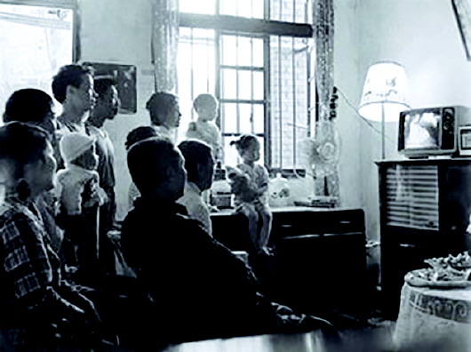 一堆人围在一起看黑白电视。资料片
