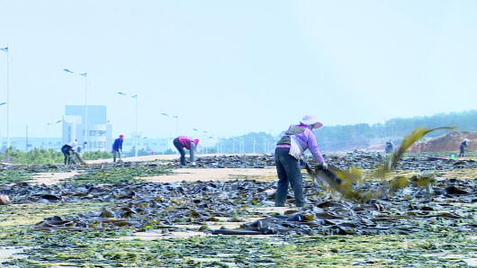 目前,我市沿海的海带进入收割期,各海带养殖单位正紧锣密鼓的进行收割晾晒,相关部门也加强海带运输管理工作,防止遗撒、滴漏现象发生。图为好运角旅游度假区的养殖户晾晒海带。