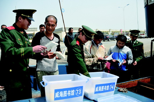 22日,孙家疃边防派出所民警携带书籍到威海中心渔港,送给渔民,丰富他们的精神生活。