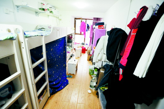 小韩的不少朋友、同学都住着群租房。在师东小区,一套90平米三室一厅的出租屋,被木板隔成了七个房间,阳台、厨房等都成了卧室。除了“五人间”,房子还有“四人间”、“双人间”等,算下来共住了20人。住户小杨是在一家单位实习的学生,他说,自己还曾住过另外一个群租房,也是三室一厅,但只有70平米,客厅里放了7张架子床,另外3个房间放了9张架子床,最多能住32个人。