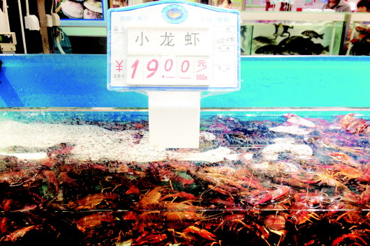 超市里的小龙虾摆在冰柜里,还标明了产地。 本报记者 左庆 摄