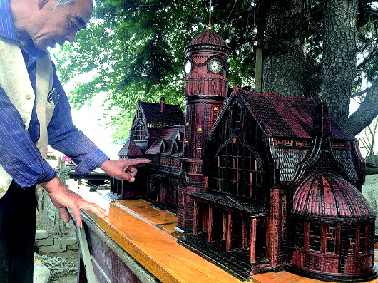 “这个模型是四个部分组合起来的,有钟楼、老售票厅、中间候车室以及西候车室,都是用红木雕刻成的,外面上了一层核桃油,核桃油比普通的油漆会更自然。”金志明说,买这些红木就花了一万多元。