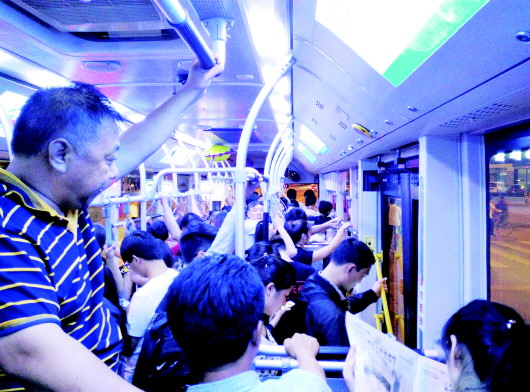 22点20多分,102路十分拥挤。 见习记者 张永宽 摄