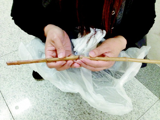 从强强脸部取出的竹竿。 本报记者 戚云雷 摄