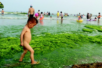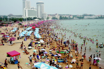 24日,在第一海水浴场,大量游客在海边纳凉戏水。 本报记者 张晓鹏 摄