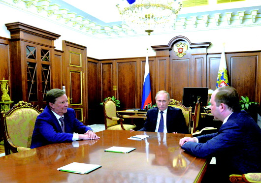 ▲12日,在莫斯科,俄罗斯总统普京(中)与新任总统办公厅主任瓦伊诺(右)及原办公厅主任伊万诺夫举行会议。