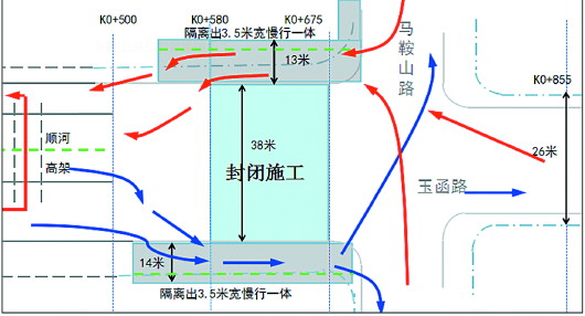 顺河高架南延马鞍山路口放开交通示意图。市政供图