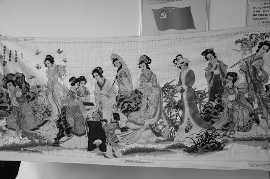 惠民县孙武镇马金梅女士,花费一年半时间,历尽心血一针一线绣制而成一幅名为《梦红楼》的大型十字绣作品,规格250CM×106CM,人物栩栩如生,背景极尽绚丽,从左至右,联系情景,推测为:史湘云(石凳上小寐)、贾迎春(贪玩)、薛宝钗(红衣服)、贾惜春(作画)、贾探春(观赏)、下面的小孩是贾巧姐、妙玉(道姑打扮)、贾元春(贵妃打扮)、王熙凤(雍容华贵)、秦可卿、香莲、林黛玉(黛玉葬花)。其中还有很多装饰品,例如人物耳饰,都是大小不一的彩珠,绣一针就要串一个,整幅作品几乎用了几百颗。