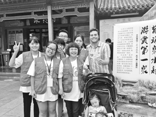 6日,山东师范大学地理与环境学院青年志愿者协会会长刘晓彤带着13名志愿者在活动现场为背诗游客和市民服务。图为志愿者和参与活动的西班牙人李阳(右一)合影。 本报记者 许建立 摄