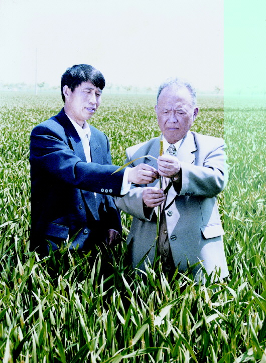 2000年,余松烈(右)与董庆裕(左)在小麦新品种93-52示范田观察小麦单株性状。(资料片)