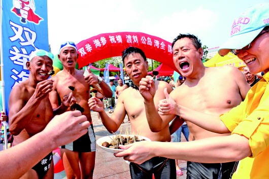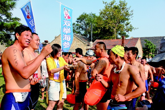 ▲在横渡刘公岛海湾全国游泳邀请赛上,赛前,双举海参为选手们送上双举海参增加体力。