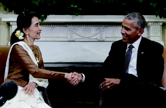 ◥14日,在美国华盛顿,美国总统奥巴马在白宫与缅甸国务资政昂山素季握手。 新华/美联