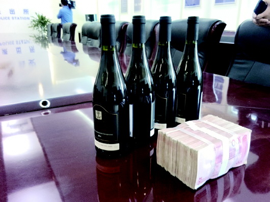 市民捡到的红酒和一沓10万元现金。本报记者 戚云雷 摄