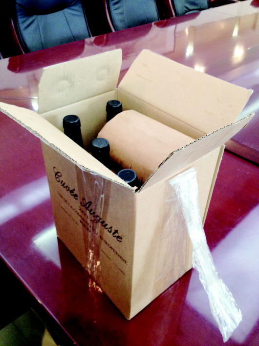 19日上午,记者在姚家派出所内见到了李先生捡到的10万元现金和红酒。记者看到,钱和酒都装在一个淡黄色的红酒包装箱里,外面用胶带打了一个提手。箱子里本来有6瓶红酒,但被拿出了两瓶,腾出的空间则放了用纸袋包好的十万元现金。红酒名为奥格斯干红葡萄酒,是由济南一家公司进口的。