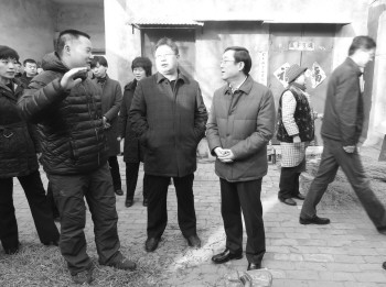 “第一书记”王建国向山东省新闻出版广电局局长司安民(右一)、莘县县委书记、县长张国洲(右二)汇报扶贫工作。