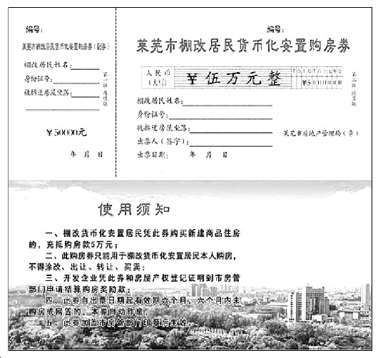 棚改货币化安置购房奖励以“莱芜市棚改居民购房券”(以下简称购房券)形式发放,每张购房券抵奖励资金5万元,符合条件的棚改居民购房时用于充抵房价款。棚改居民登录市房地产管理局政务网站下载或到市房地产交易大厅住房保障窗口领取并填写《莱芜市棚改货币化安置购房奖励申请审批表》,同时向市房地产交易大厅住房保障窗口提供个人身份证明、棚改货币化安置购房协议等证明材料。经审查符合条件的,向其发放购房券,审查通过人员名单在市房地产管理局政务网站公布。棚改居民持购房券,到市房地产管理部门公布的房源选购住房,与开发企业结清扣除购房奖励5万元后的剩余房款后,开发企业办理商品房网签合同备案,棚改居民应在备案后5个工作日内将网签合同送交市房地产交易大厅住房保障窗口。棚改居民所购住房在办理产权证后,开发企业凭购房券和房屋产权登记证明到市房地产管理部门申请结算奖励资金。市房地产管理部门审核后,会同市财政部门与开发企业结清奖励资金。