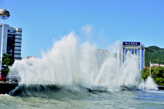 19日中午,受大风影响,市区幸福公园海岸激起近10米高的浪花。