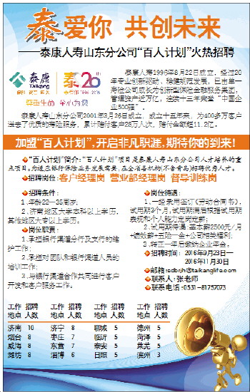 爱你 共创未来 ——泰康人寿山东分公司“百人计划”火热招聘   泰康人寿1996年8月22日成立,经过20年专业创新驱动、稳健规范发展,已由单一寿险公司成长为创新型保险金融服务集团,管理资产近万亿,连续十三年荣登“中国企业500强”。   泰康人寿山东分公司2001年3月26日成立,成立十五年来,为400多万客户送去了优质的寿险服务,累计赔付客户28万人次,赔付金额超11.2亿。 加盟“百人计划”,开启非凡职涯,期待你的到来!   ◆“百人计划”简介:“百人计划”项目是泰康人寿山东分公司人才培养的重点项目。为适应银行保险业务发展需要,在全省各机构(不含青岛)招聘优秀人才。   ◆招聘岗位:客户经理岗 营业部经理岗 督导训练岗   济南 10   烟台 8   威海 8   潍坊 8   济宁 8   枣庄 7   东营 7   淄博 6   聊城 5   临沂 5   泰安 5   日照 5   德州 5   菏泽 5   莱芜 5   滨州 3   ◆招聘条件:   1、年龄22—35周岁;   2、济南地区大学本科以上学历,其他地区大专以上学历。   ◆岗位职责:   1、承担银行渠道分行及支行的维护工作;   2、承担对团队和银行渠道人员的培训工作;   3、与银行渠道合作共同进行客户开发和客户服务工作。   ◆岗位待遇:   1、一经录用签订《劳动合同书》,试用期3个月,试用期满后根据试用期表现和个人能力定岗定薪;   2、试用期待遇:基本薪2500元/月+绩效薪+五险一金+公司相关福利;   3、转正一年后缴纳企业年金。   ◆招聘时间:2016年9月23日—   2016年11月30日   ◆邮箱:sdbrjh@taikanglife.com   ◆联系人:张老师   ◆联系电话:0531-81757073 泰   工作 招聘   地点 人数   工作 招聘   地点 人数   工作 招聘   地点 人数   工作 招聘   地点 人数
