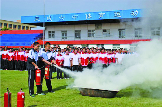 日前,荣成六中组织高一新生参加了消防安全知识进校园专题讲座,并开展消防逃生疏散演练。