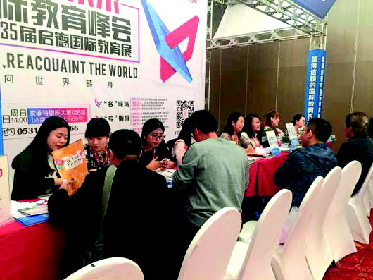 在国际教育展上,家长正在咨询留学问题。