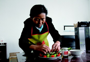 “平时调的黄瓜条,小孩子都不喜欢。但是黄瓜对于现在整天大鱼大肉的人来说,是非常好的蔬菜,可以降低胆固醇、分解脂肪,所以我就想了这种办法,让孩子们把黄瓜当水果吃。”3号参赛选手曹爱香的香油黄瓜获得了“厨娘大赛”的一等奖。
