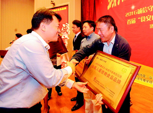 本报济南10月16日讯(记者 张召旭) 9月29日上午,由大众报业集团、齐鲁晚报联合省食品工业协会、畜牧协会、旅游饭店协会、果品协会等主办的2016诚信守望典型公选新闻发布会暨首届“食安山东·诚信守望”报告会在山东大学中心校区隆重举行。70家品牌企业和个人以“十分靠得住”的质量和管理赢得“食安山东·诚信守望”信誉大奖,150余家食品企业400余人现场参加颁奖活动,聆听诚信报告。