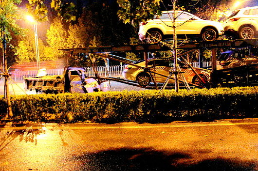 监控显示,当晚8点34分,满载新车的运输车缓缓在事发地停下,刚停了两分钟,一辆三轮车驶了过来,直到距离运输车尾部大约五米远时,三轮车猛地向左转向,试图躲开前方的运输车,但为时已晚。三轮车的前部顶上了运输车尾部凸出的钢梁。
