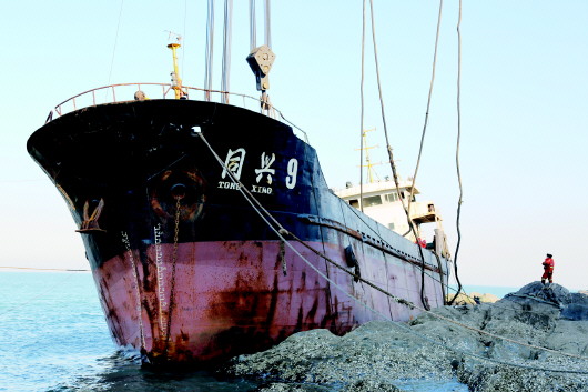 负责打捞工作的交通运输部烟台打捞局相关人士介绍:“‘同兴9’轮,船长51.8米、型宽8.8米、型深4.08米。1月30日凌晨,‘同兴9’轮在码头靠泊时受九级大风影响,船艏、船艉6根缆绳全部断裂,船舶顺风漂移5公里,搁座于烟台市著名的烟台山景区北麓礁石上。搁浅位置扼烟台港进出港航道咽喉,对密集的过往船舶及景区游人安全造成了极大威胁,且难船船体受损严重,内存燃油一旦泄漏,将对烟台山景区甚至整个芝罘湾海域带来灾难性后果。”