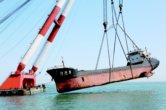 “同兴9”被整体吊离水面。