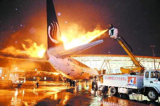 2月21日傍晚,济南迎来2017年首场降雪,济南机场航前出港的飞机被大雪覆盖。山东太古的机务人员及时为飞机除冰雪,各项工作有序开展,全力保障航班安全正点运行。