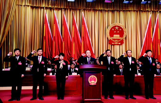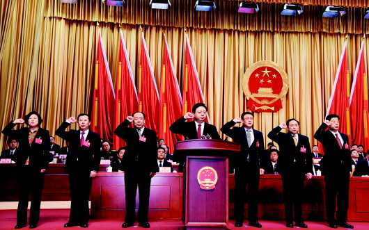 德州市第十八届人大常务委员会主任韩建亭(左四),副主任魏洪祥(右三)、钟玲(左三)、周玉刚(右二)、陈璞平(左二)、冯如胜(右一),秘书长周天峰(左一)向宪法宣誓。