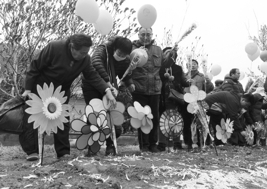 这是在济南玉函山公墓举行的山东省暨济南市2017年节地生态葬安葬及共祭仪式,30位逝者家属依次将装有骨灰的花坛按照编号放入花穴,集体默哀并集体鞠躬悼念。“大伯一生没有结婚,无儿无女,把他葬在花坛,还能不孤单。”兰小萍说,“我大伯是低保户,选择花坛葬等生态安葬的话,还是免费的。”