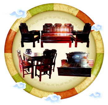 非洲花梨木套餐:25件套,原价24.9万元,优惠价格4.58万元(床3件,沙发6件,餐桌7件,圈椅3件,花架2件,鼓凳2件,衣架2件)。