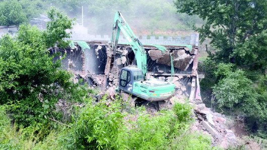 23日早7点,拆除队伍进场,随着挖掘机的轰鸣声,水库边农家乐两个小时便被拆除。