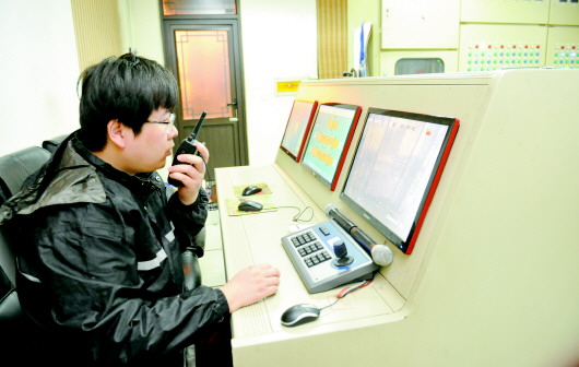 18日晚10点30分左右,天下第一泉景区船闸站夜班工作人员郑晨旭与上游河道工作人员用实时对讲机沟通水位状况。 本报记者 徐延春 唐园园 摄影报道