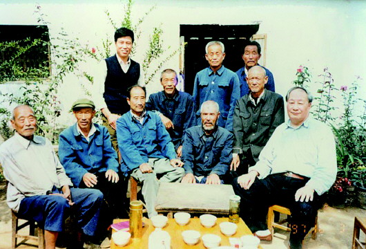 1997年10月拍《沂蒙之恋——父子作家故乡情》时,苗得雨父子与乡亲合照。前排右一为苗得雨先生。