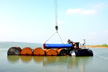 本报文登7月18日讯(记者 李伟 通讯员 侯军友) 为了保证城区正常供水,威海水务集团文登区自来水公司工作人员在米山水库进行二次导水工程紧张施工。