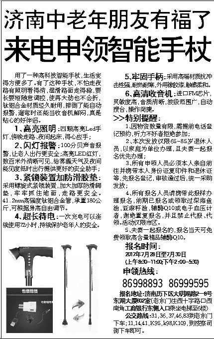 用了一种高科技智能手杖,生活变得方便多了。有了这种手杖,不怕走夜路有照明看得清,湿滑路面走得稳,要长要短随意调控,使再大劲也不会折,钛铝合金材质经久耐用,摔倒了能自动报警,遛弯时还能当收音机解闷,真是贴心的好伴侣。
