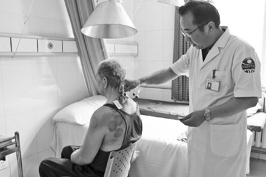 走进济南明水眼科医院中医科,十几平米的治疗室内弥漫着浓重的艾草味道。王洪卫正在为患者进行督灸治疗。“因为这位患者每天站立在风口,日积月累导致邪湿侵入身体,患者经常腰痛甚至难以站立。根据患者的情况我采用督灸疗法进行治疗,取督脉大椎至腰俞的脊柱部位,用生姜艾沫搭配燃烧去除患者体内的湿气。”王洪卫边为患者治疗边向记者介绍该疗法。这只是王洪卫众多疗法中的一种。在临床上,他还运用温针灸、豪火针、电针、刺血拔罐、脊柱锤正、手法推拿等治疗方法。