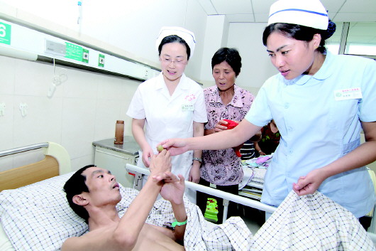 从入院到与家人相见,已经时隔266天,这期间他的吃喝拉撒全部由临沭县人民医院脑外科的23名护士轮流照料。“一天大便五六次,每隔两小时就得翻身,我们照顾三天就觉出累了,真不知道这些护士是怎么熬过来的。”8月9日下午,本报记者见到躺在病床上的刘修德时,他的母亲杨连粉正在护士的帮助下为他擦洗身子,杨连粉一边忙活一边夸赞身边的护士。